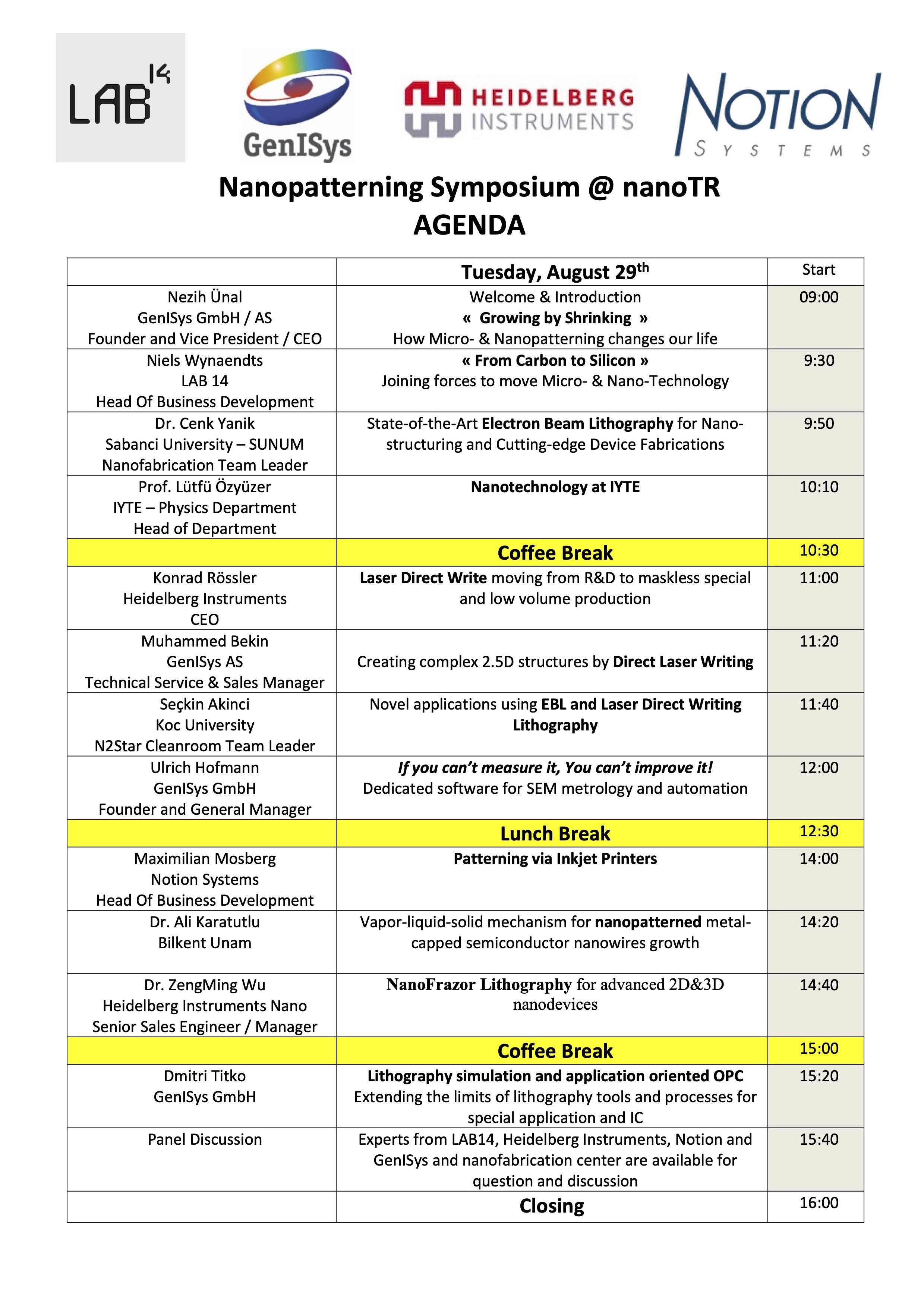 This symposium is focusing on the latest trends and solutions in nano-patterning with presentations and discussions by international nanofabrication experts from research, industry, equipment, and software suppliers. The agenda will be announced at the end of July and is still open for user presentations.